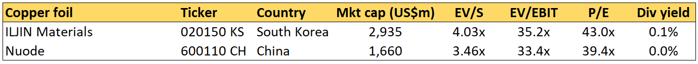The copper foil used in batteries is produced by both Iljin Group’s listed subsidiary Iljin Materials and Shenzhen-based Nuode Investment Co. Neither of them has large exposures to the EV industries, and return on capital has historically been weak.