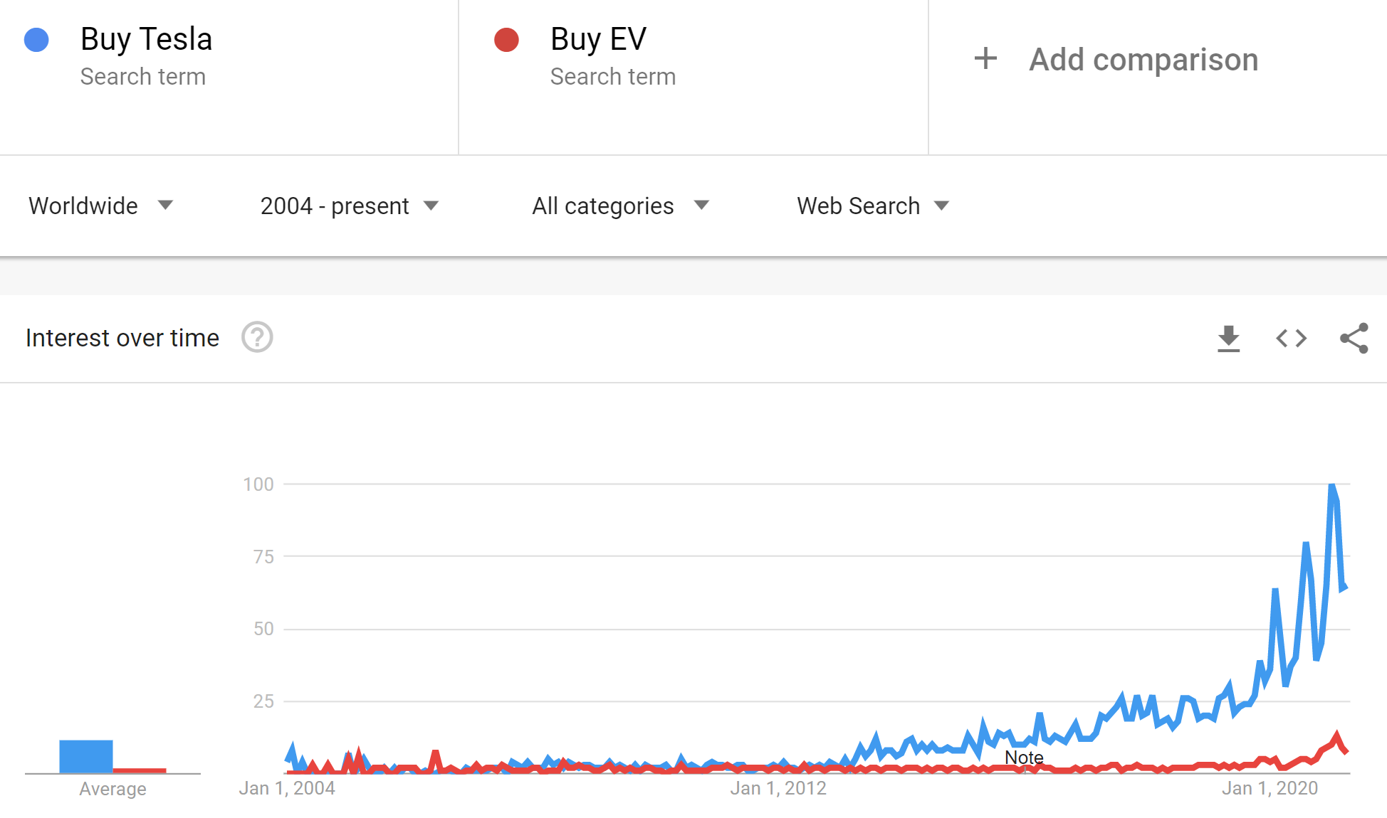 You will find that there is an increasing interest in buying electric vehicles as well. At least Teslas. If you compare the search interest for “Tesla” and “EVs”, it looks like consumers are actually more interested in the Tesla brand itself rather than EVs as a product.