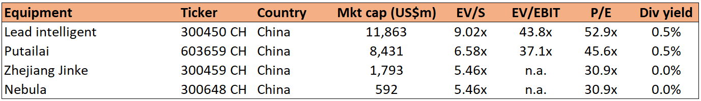 Wuxi Lead Intelligent produces electronic capacitors and lithium battery equipment, especially for pouch batteries. Putailai produces anode materials and coating membranes. Zhejiang Jinke’s chemical business is a small portion of the total. Nebula manufactures inverters and battery testing equipment.