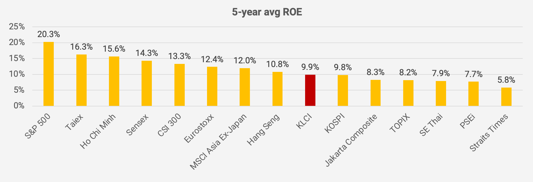 A P/E of 14.3x is not particularly compelling in relation to the index’s 5-year average return on equity of 9.9%. Several other Asian countries such as Taiwan, India and the Vietnam show much higher return on equity.