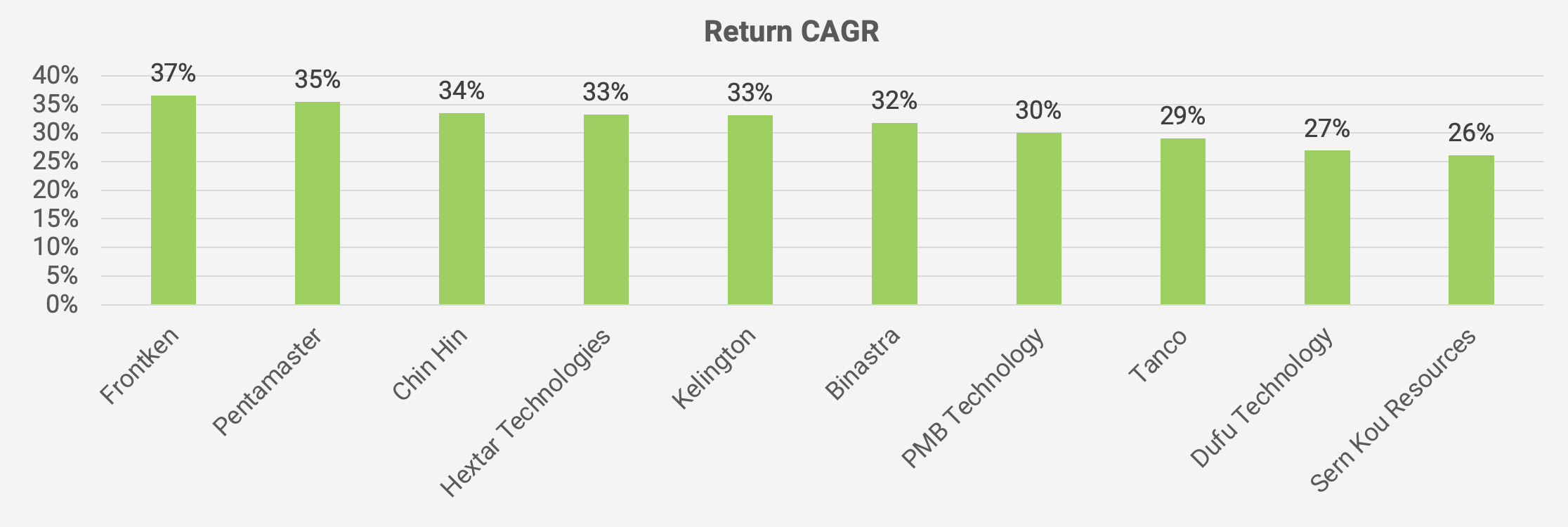 The Malaysian companies with the highest total returns include Frontken Corporation provides precision cleaning and coating for semiconductor parts, including for Taiwan’s TSMC. They also include Pentamaster Corporation, a sister company to the Pentamaster International I wrote about last year. Chin Hin Group is a cement company. Hextar Technologies is a trading company that now has a fintech app called MoneyX. Kelington Group makes gas and chemical delivery pipes for chip fabs. Binastra is a building contractor for condos, offices, retail lots and data centers. PMB Technology smelts silicon metal at a plant in Sarawak. Tanco is another construction companies, owning a large seafront landbank in Port Dickson. Finally, Sern Kou Resources owns owns sawmills and a furniture factory that exports to the United States.