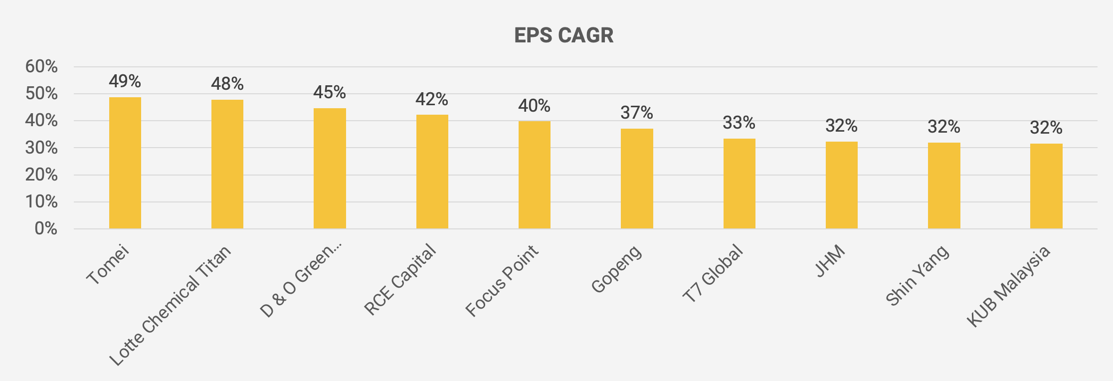 The fastest-growing companies in terms of EPS have been Tomei, the jewelry company, which I suspect has been benefiting from a strong demand for gold. Then Lotte Chemical Titan, the operator of a petrochemical plant in Johor. D&O Green Technologies designs LED chips used in car headlamps, etc. RCE Capital is a payroll lender. Focus Point runs Malaysia’s largest optical retail chain. Gopeng owns an oil palm estate and has property developments around Perak. T7 Global is an oil services contractor, helping with rig decommissioning, maintenance, etc. JHM makes LED modules and precision machinery for third parties. Shin Yang is a shipping company with four shipyards in Sarawak. And finally, KUB Malaysia is a distributor of LPG cylinders to households.