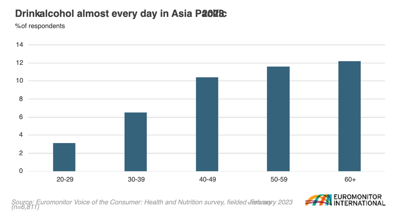 When it comes to alcohol use, the data is mixed. Younger individuals seem to be less likely to drink than older in the Asia-Pacific: