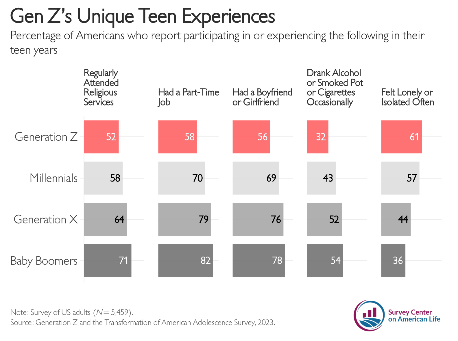 Meanwhile, we’re seeing children mature more slowly than in the past. Key milestones such as having had a part-time job, getting a driver’s license, having a girlfriend or boyfriend, or drinking alcohol are delayed into later in life, into their 20s. They also report feeling lonely and isolated more often: