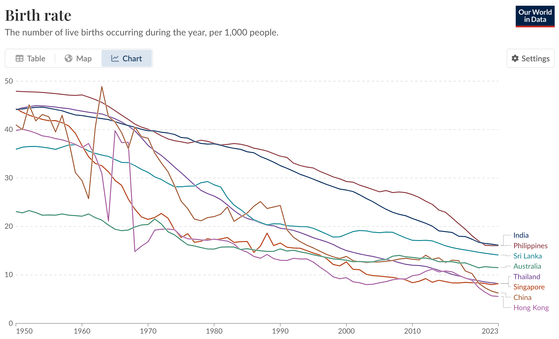 Lower marriage rates and higher age of first marriage have direct implications on fertility. The birth rate is falling almost across the board, partly due to the fact that female fertility drops fast after the age of 34.