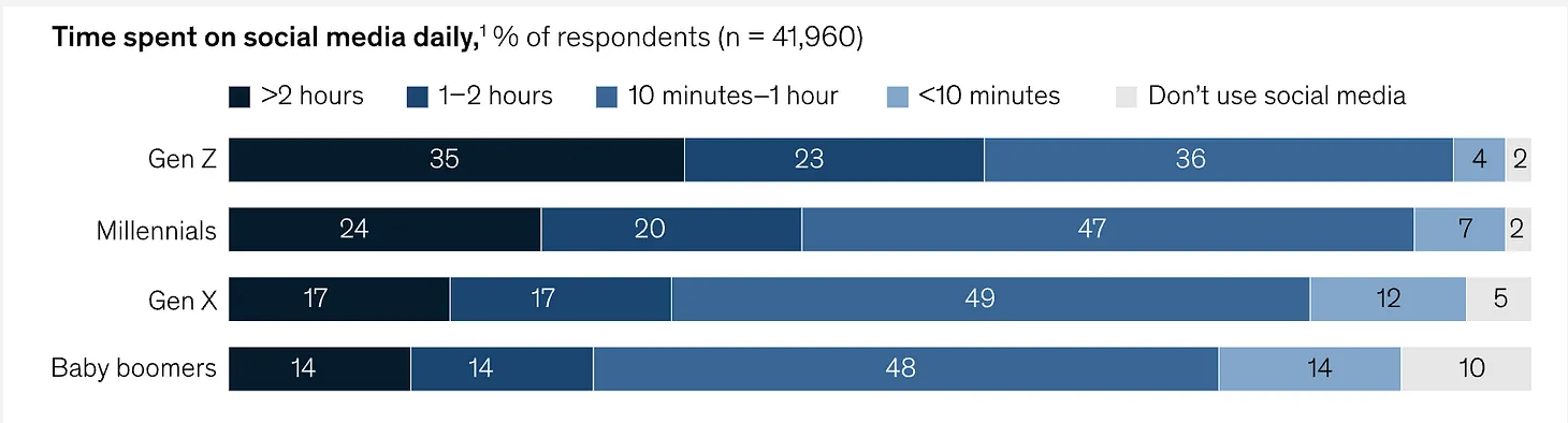 The key draw seems to be social media platforms such as Instagram and TikTok/Douyin. Global data from McKinsey suggest that Zoomers spend over 1 hour on social media per day — roughly twice as much as long as their older counterparts: