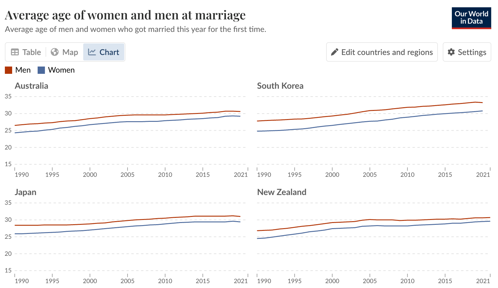 The average age of first marriage is moving higher and higher across almost all geographies, crossing the 30-line for most of the developed Asia-Pacific.
