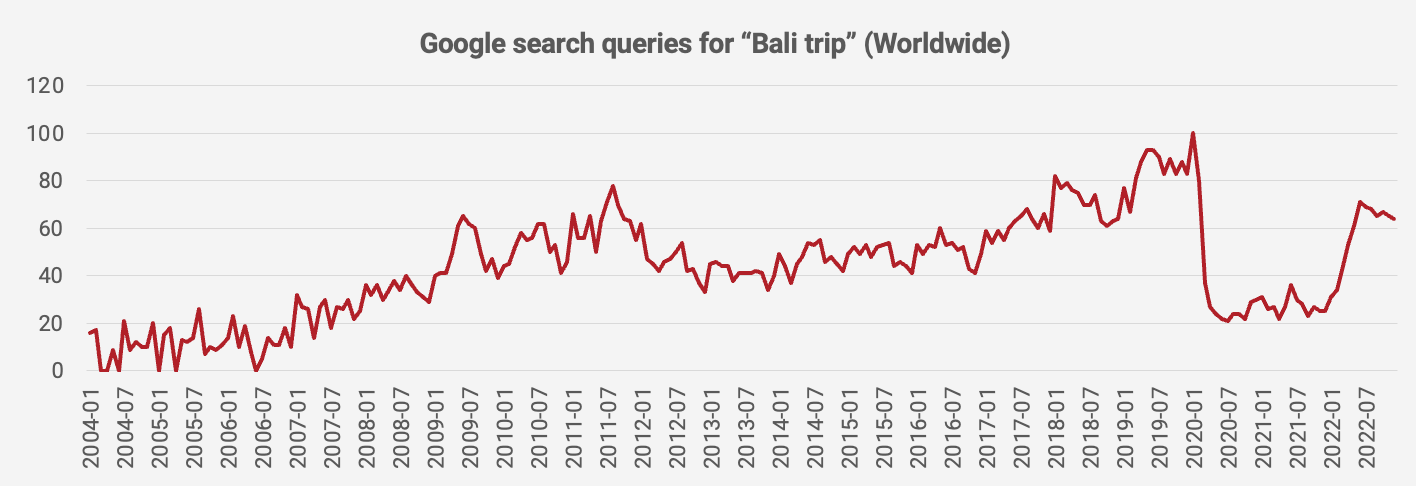 So far, the number of Google search queries for Bali tourist-related keywords has continued to be strong since Bali opened up its borders earlier this year: