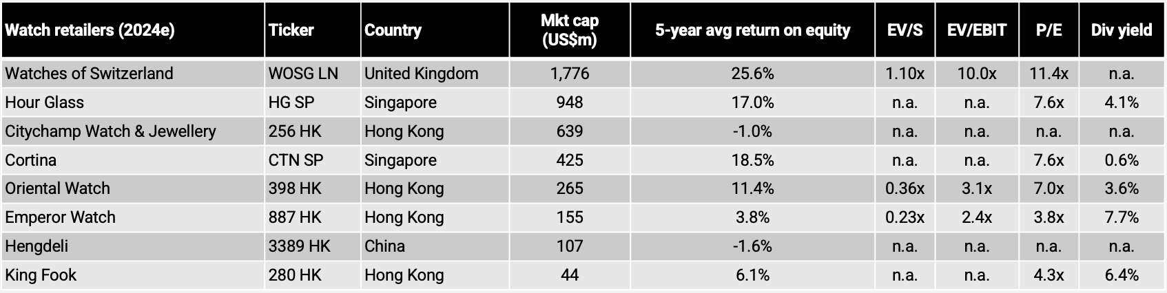 I only found one listed wristwatch retailer in Europe: the UK’s Watches of Switzerland (WOSG LN - US$1.8 billion). It offers the typical luxury wristwatch brands such as Rolex, Patek Philippe, Omega, Cartier, etc. In Hong Kong, you’ll find Rolex dealer Oriental Watch (398 HK - US$265 million), Emperor Watch (887 HK - US$155 million), Citychamp Watch & Jewellery (256 HK - US$639 million) and China’s Hengdeli (3389 HK - US$107 million).