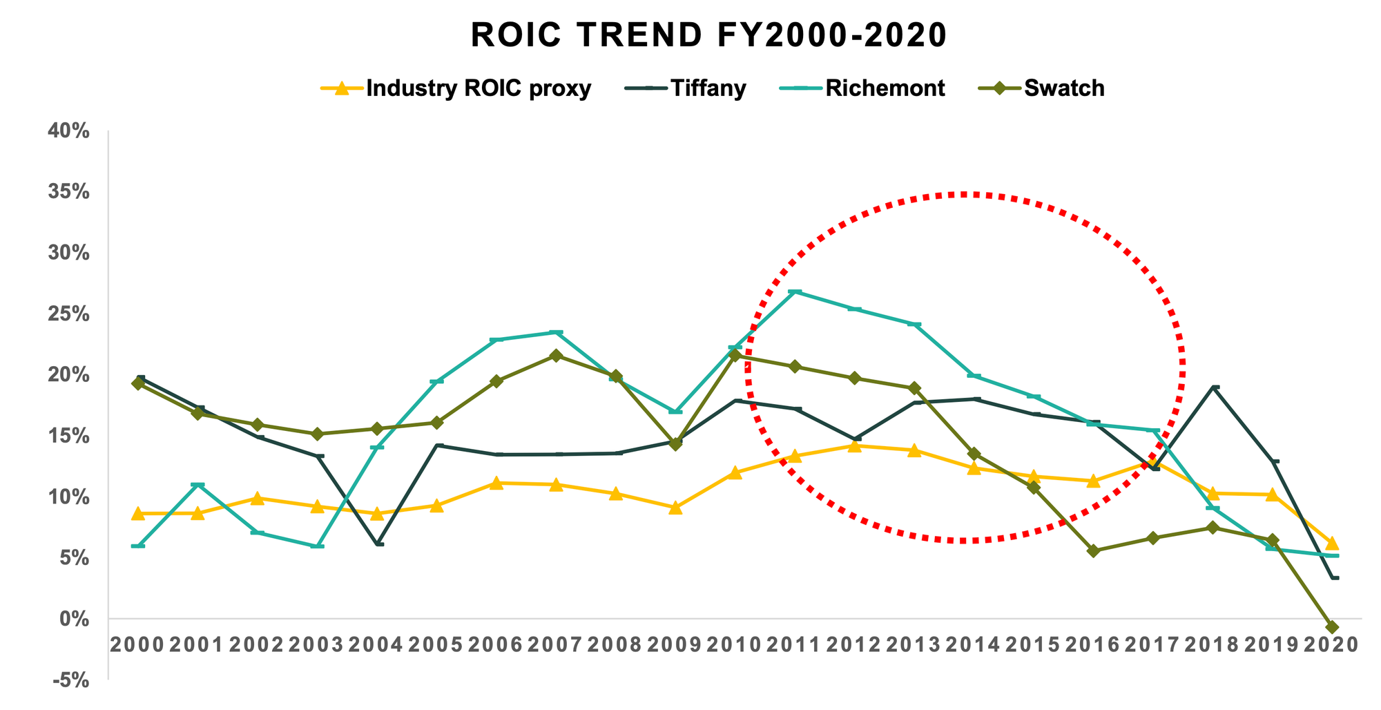Another way to illustrate the Apple Watch's challenge on the industry is the return on invested capital (ROIC) by the largest companies in the industry. Pure-play watchmakers Richemont and Swatch have both seen their ROIC fall, but especially Swatch, given its larger exposure to the entry-level segment.