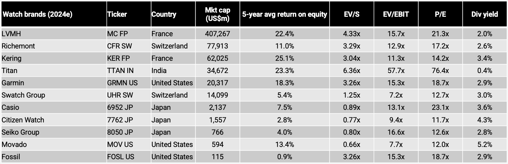 The largest listed entities have not performed as well in the competition with the Apple Watch. For example, Richemont (CFR SW - US$74 billion) has an incredible stable of brands, including Cartier, Panerai, Vacheron Constantin, IWC, Jaeger-LeCoultre Mont Blanc, A Lange & Söhne and more. After its 2008 spin-off of British America Tobacco, Richemont is almost exclusively focused on jewellery and wristwatches. However, its return on equity remains barely higher than the cost of capital.