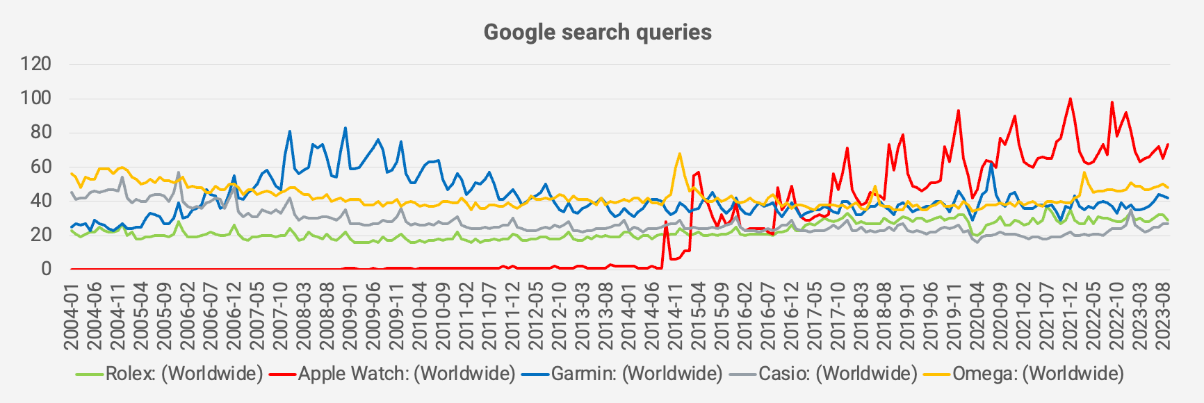 Today, smartwatches continue taking market share as they become more capable. An index of the number of Google search queries for the Apple Watch is now higher for the Apple Watch than any of the major watch brands: Rolex, Omega, Casio and others: