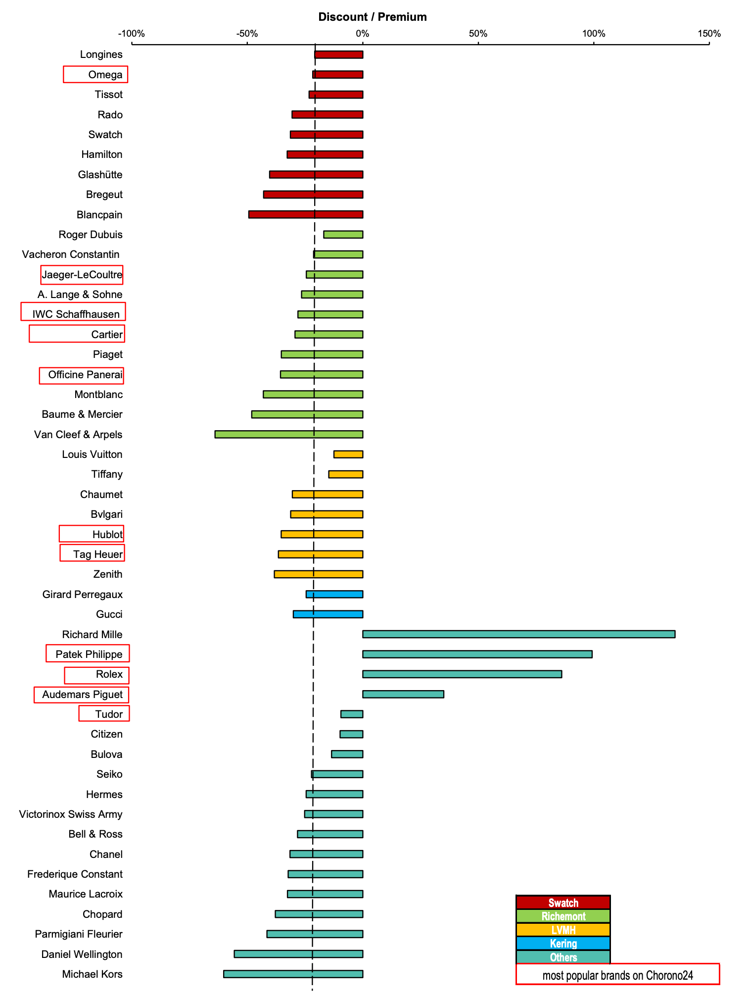 This chart from Bernstein, with data from Chrono24, shows the discounts vs. premiums that different brands enjoyed in the second-hand market in 2021: