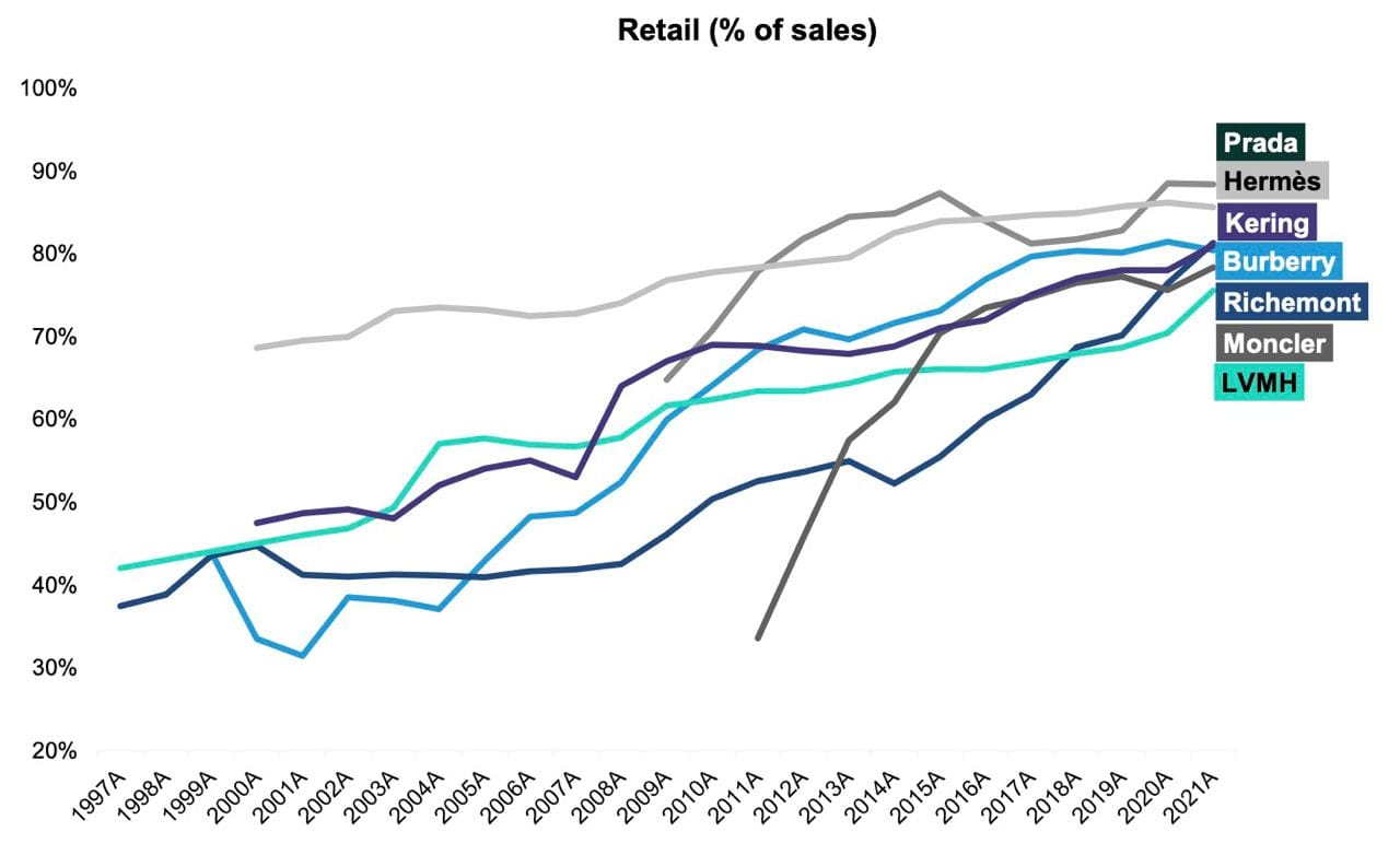 In the luxury goods industry, vertical integration has been a long-term trend pioneered by LVMH, Richemont, etc.
