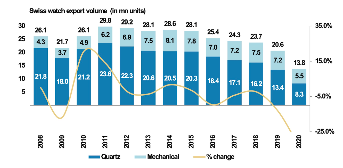 Even since the Apple Watch was released in 2015, Swiss watch export volumes have been in structural decline: