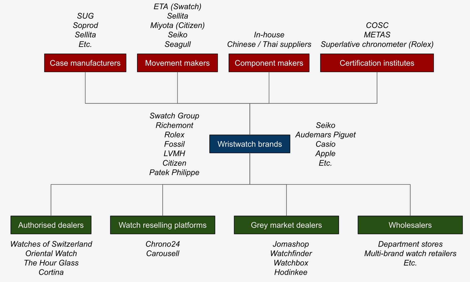 Distribution typically occurs through authorised dealers, the wholesale market, or multi-brand watch retailers. Authorised dealers work with specific brand names, getting privileged access to watches in return for maintaining high professionalism and price discipline. However, authorised dealer contracts can be revoked at any time, making the value of their cash flow streams uncertain.