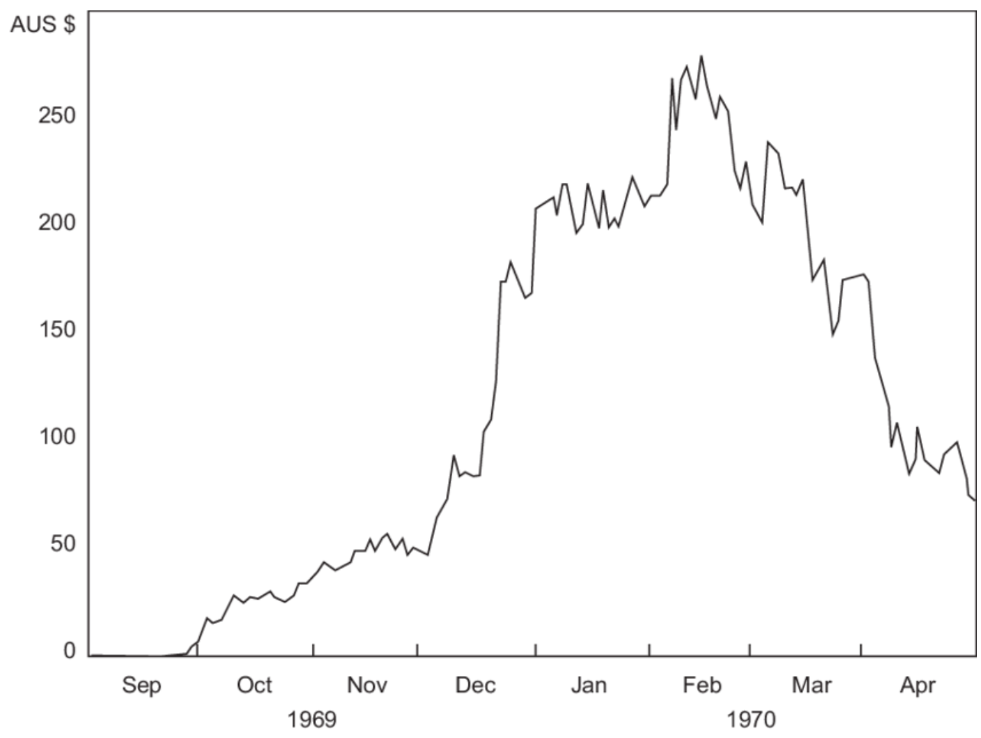 By mid-October, Poseidon’s share price had reached AU$23, up almost a thousand times since Boris Ganke initially bought his shares. The next morning, in early trading, one operator shouted across the floor: “Buy Poseidon at AU$30”. And suddenly, the price shot up to AU$31, up another eight dollars above its previous price.