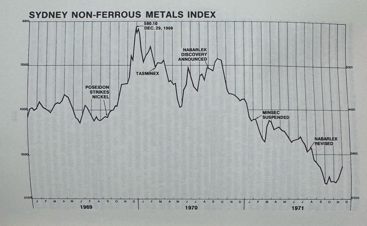After falling in the early parts of the 1970s, the non-ferrous metals index finally rebounded temporarily. The Western Australian government imposed a ban on pegging in February 1970 due to excess paperwork, and that ban was finally lifted in June 1970.