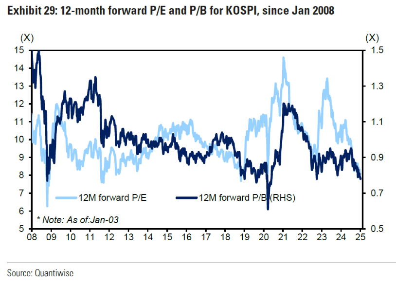 KOSPI’s P/B ratio is nearing its 2008 lows. And the forward index P/E is now close to just 8x: