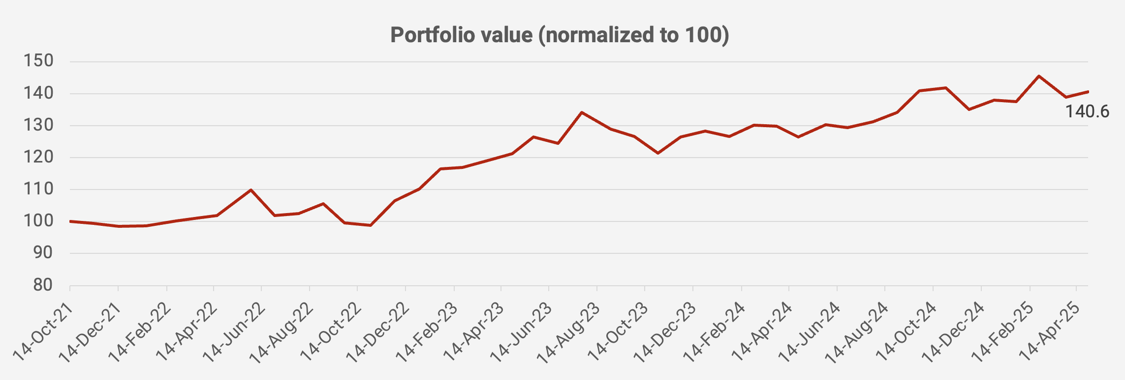 The portfolio rebounded last month despite significant intra-month volatility. Since its inception in October 2021, the value of the portfolio has now increased by +40.6%, equivalent to a +10.1% compound annual growth rate:
