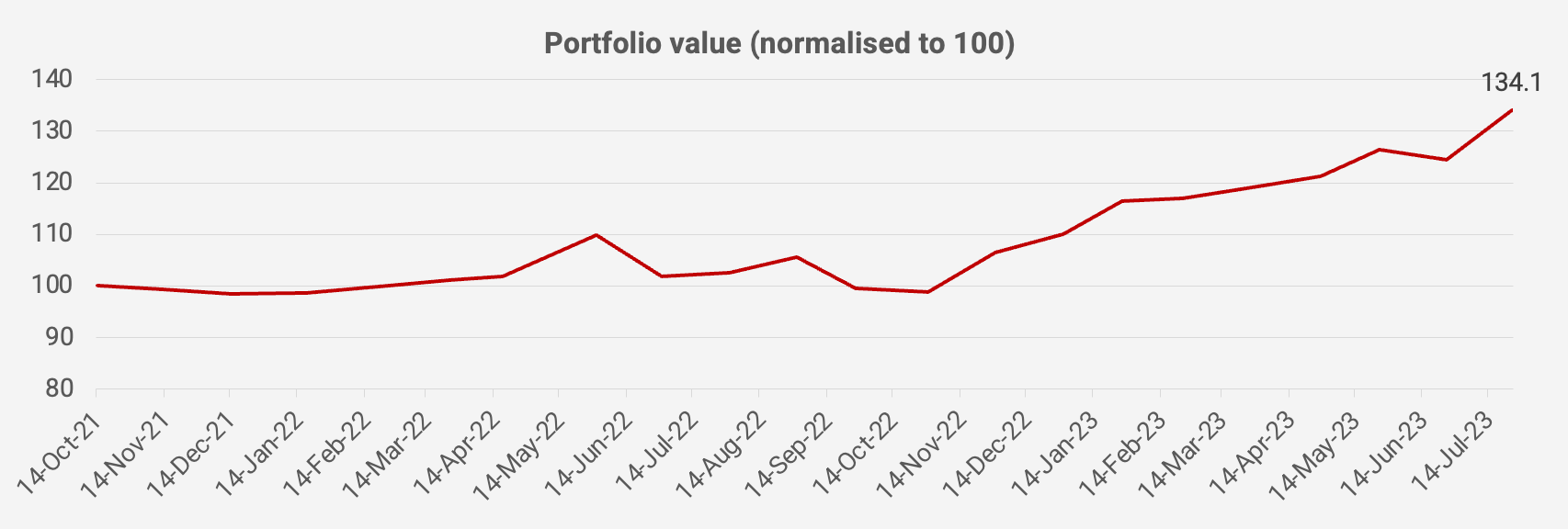 A great month for the portfolio. The value rose +7.8% month-on-month and is now +34.1% since inception in October 2021, equivalent to an IRR of +18.0%. US Dollar weakness explains part of the gain, as the portfolio value is measured in USD.