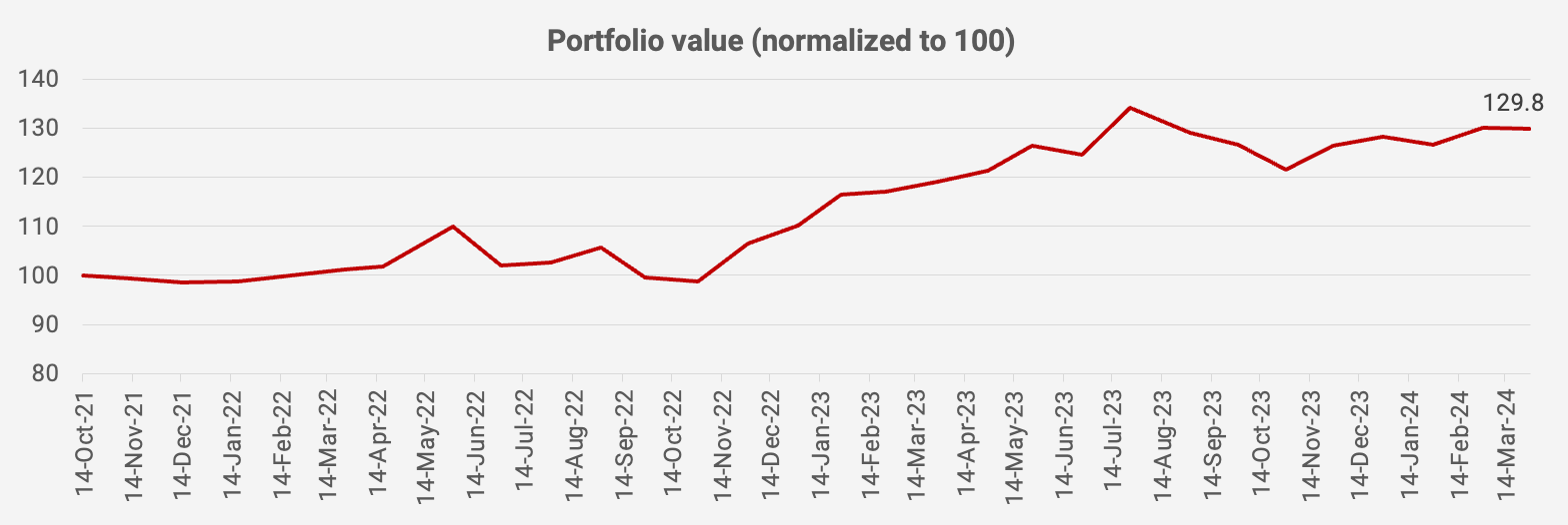 My portfolio was down slightly in March 2024, with a negative -0.2% month-on-month and +29.8% since inception in October 2021, equivalent to an IRR of +11.2%.