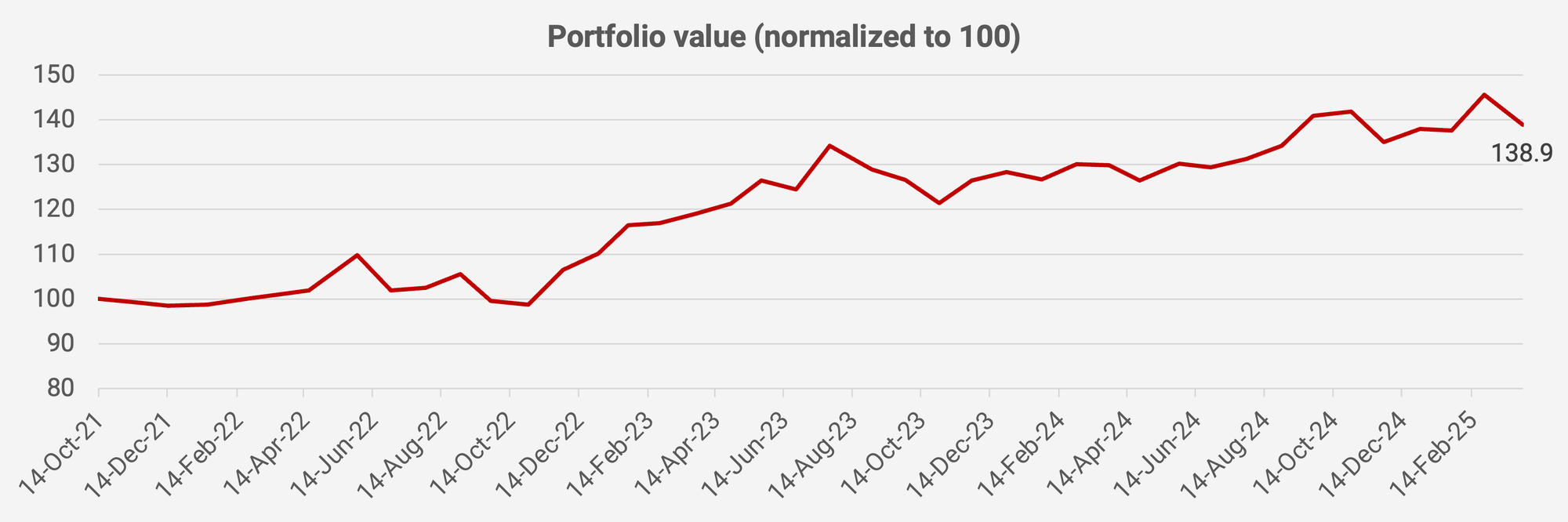 March was rough for the portfolio as US tariffs started to be priced in. The portfolio value dropped -4.6% month-on-month. Since inception in October 2021, the value of the portfolio has now increased +38.9%, equivalent to a +9.9% compound annual growth rate: