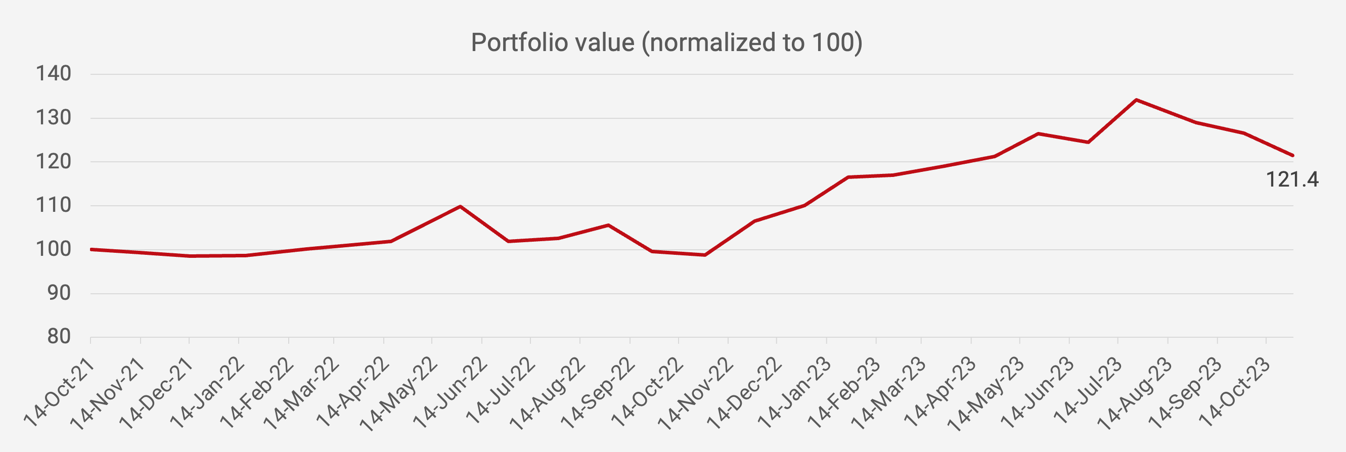 Painful month. The portfolio's value fell by -4.1% month-on-month and is now +21.4% since inception in October 2021, equivalent to an IRR of +10.0%.