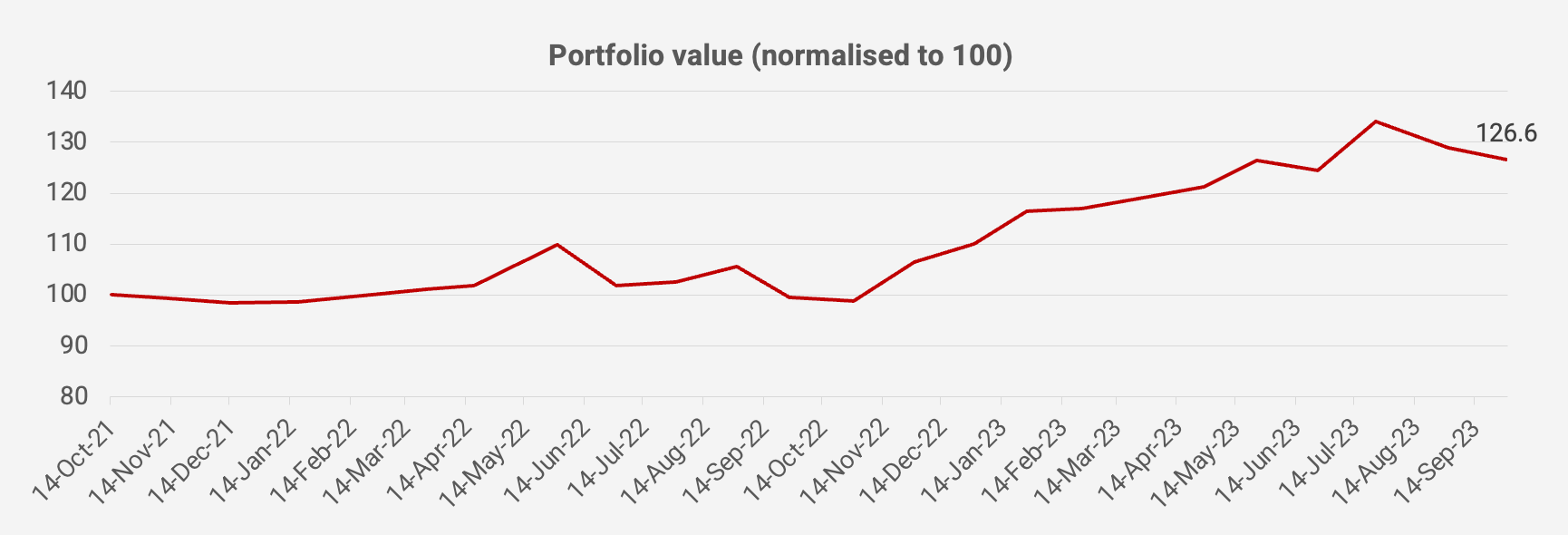 Another weak month. The portfolio's value fell by -1.9% month-on-month and is now +26.6% since inception in October 2021, equivalent to an IRR of +12.8%.