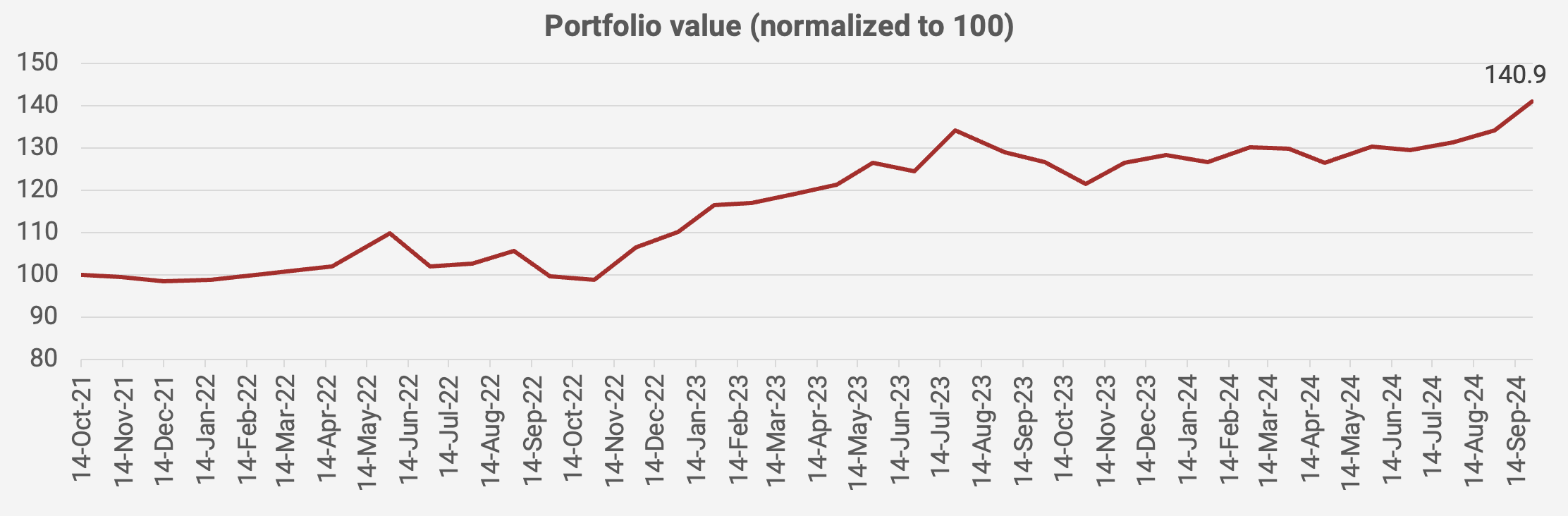 The portfolio continued rising in September, up another +5.0% month-on-month. The value of the portfolio is now up +40.2% since October 2021, equivalent to a +12.3% compound annual growth rate: