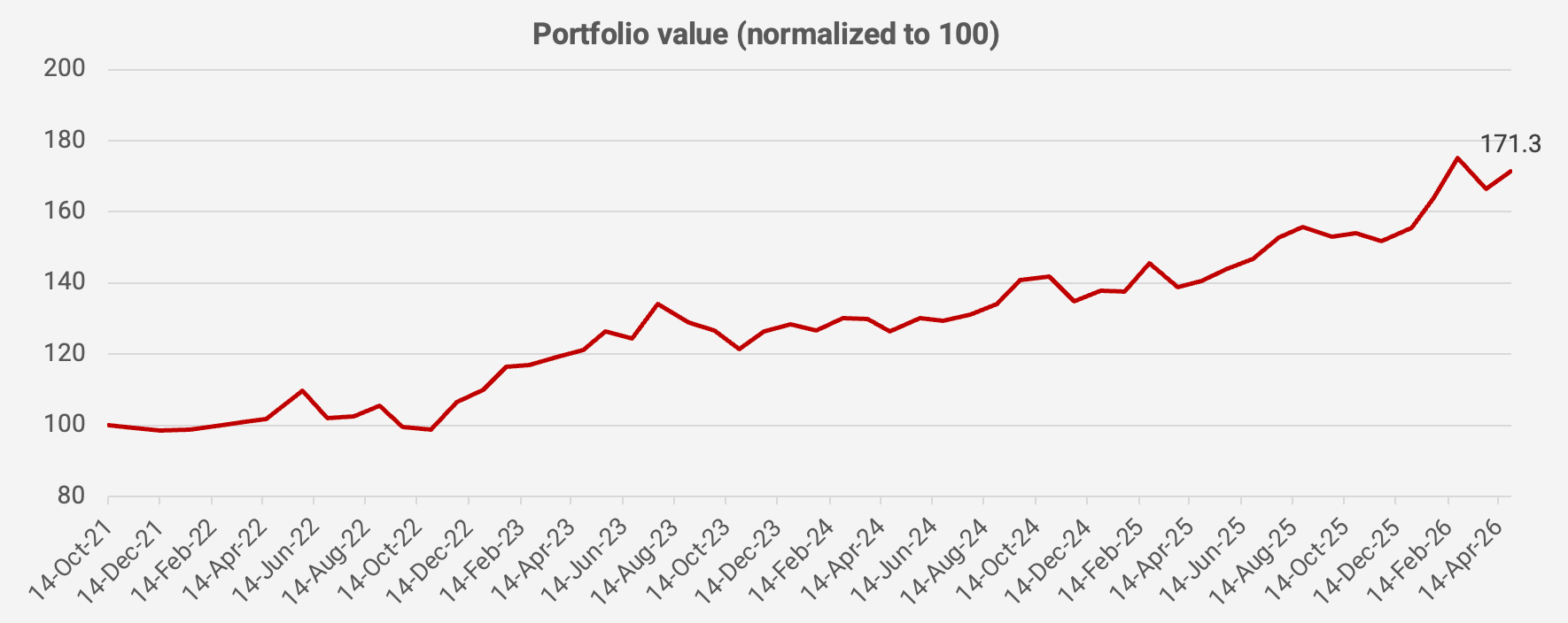 My portfolio had a nice little rebound of +3.0% month-on-month in April 2026, driven by strength in my Japanese software stocks. Since the portfolio's inception in October 2021, the portfolio's value has increased by +71.3%, equivalent to a +12.6% compound annual growth rate: