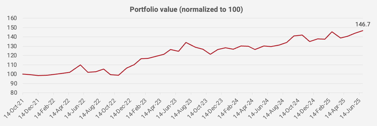 The portfolio’s value increased again in June 2025, up +2.1% month-on-month. Since the portfolio’s inception in October 2021, the value has now increased by +46.7%, equivalent to a +10.9% compound annual growth rate: