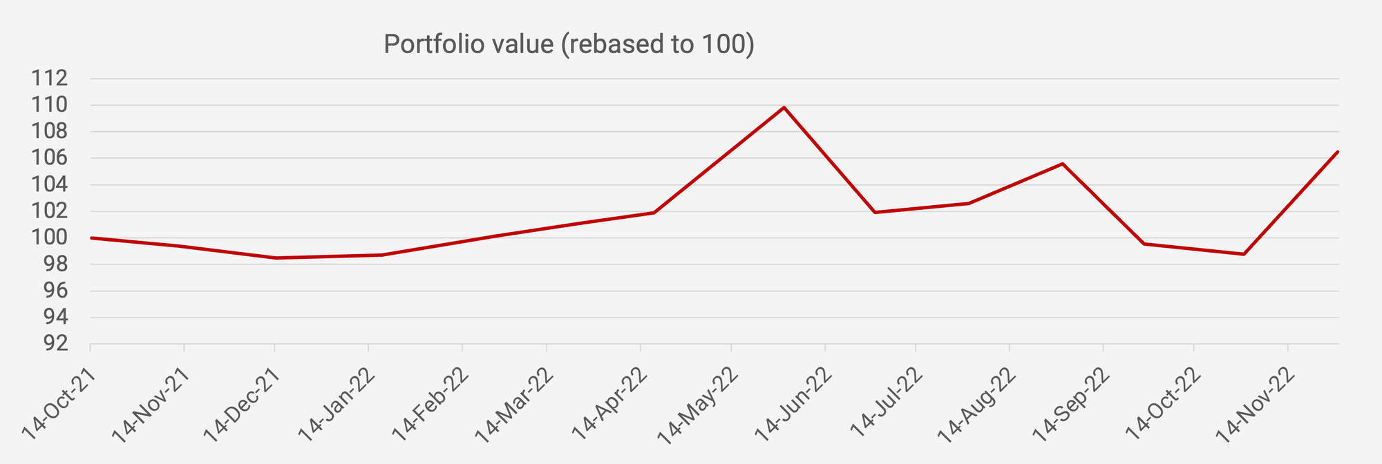 Finally, some sail in the wind. The portfolio rebounded sharply in November, up +7.8% month-on-month and up +6.5% since inception in October 2021 in US Dollar terms.
