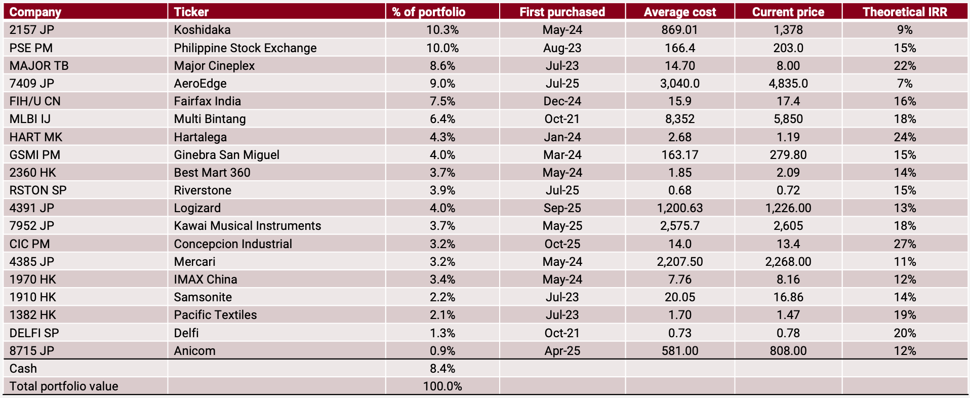 This portfolio is a work in progress. My goal is to have a portfolio with prospective IRRs above 20% across the board. It's certainly not there yet. Only a few companies live up to that standard: for example, Major Cineplex and Concepcion Industrial.