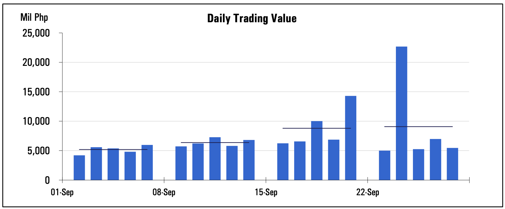 PSE's trading volumes were volatile in September. In any case, the baseline average daily trading volume doesn't seem to exceed the first-half average of PHP 6 billion. So I'm not convinced that CMEPA has actually led to much of an uptick in trading volumes, or at least not yet.