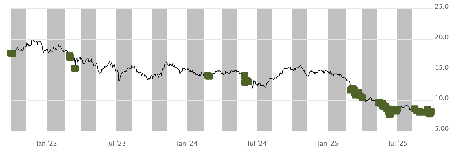 Delfi now trades at a forward P/E of 13.5x. The normalized P/E should be closer to 8x. Delfi's EPS hit US$8 cents in 2023, and the stock price trades no higher than US$64 cents, though denominated in Singapore Dollars. Still no insider buying, as far as I can tell, but that would be a sign that the shares are finally bottoming out.