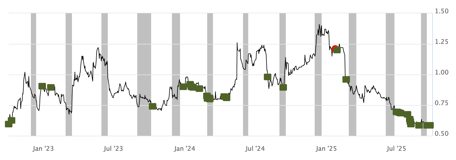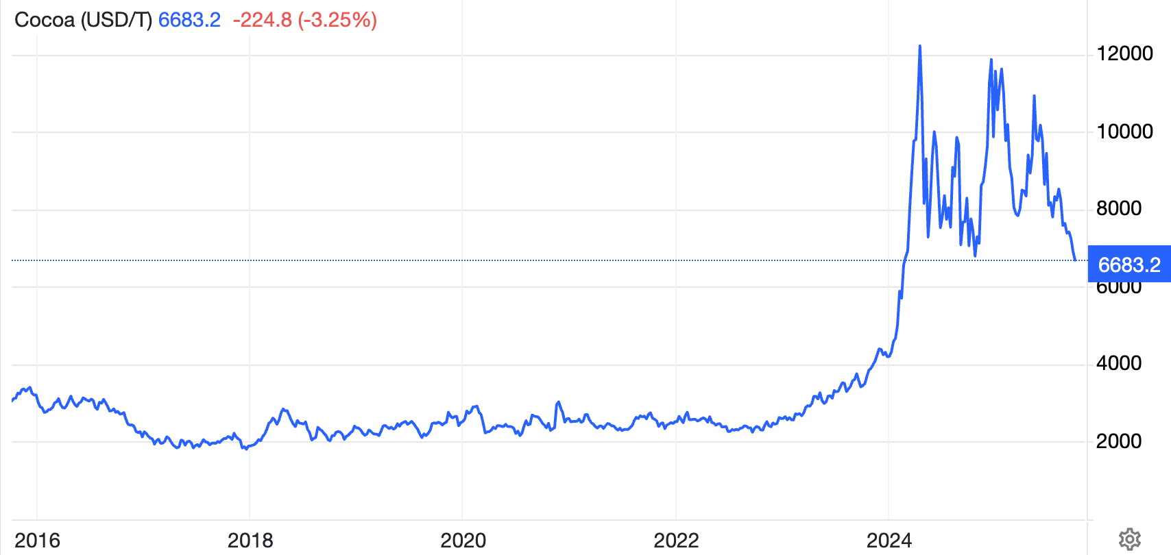 When it comes to Indonesian chocolate manufacturer Delfi (DELFI SP — US$365 million) (1.3% position), I'm noting that Atlantic sea surface temperatures dropped significantly in September. This suggests a cooling climate, which would be bearish for cocoa prices and bullish for Delfi. I'm also noting that cocoa prices are at their lowest point since early 2024: