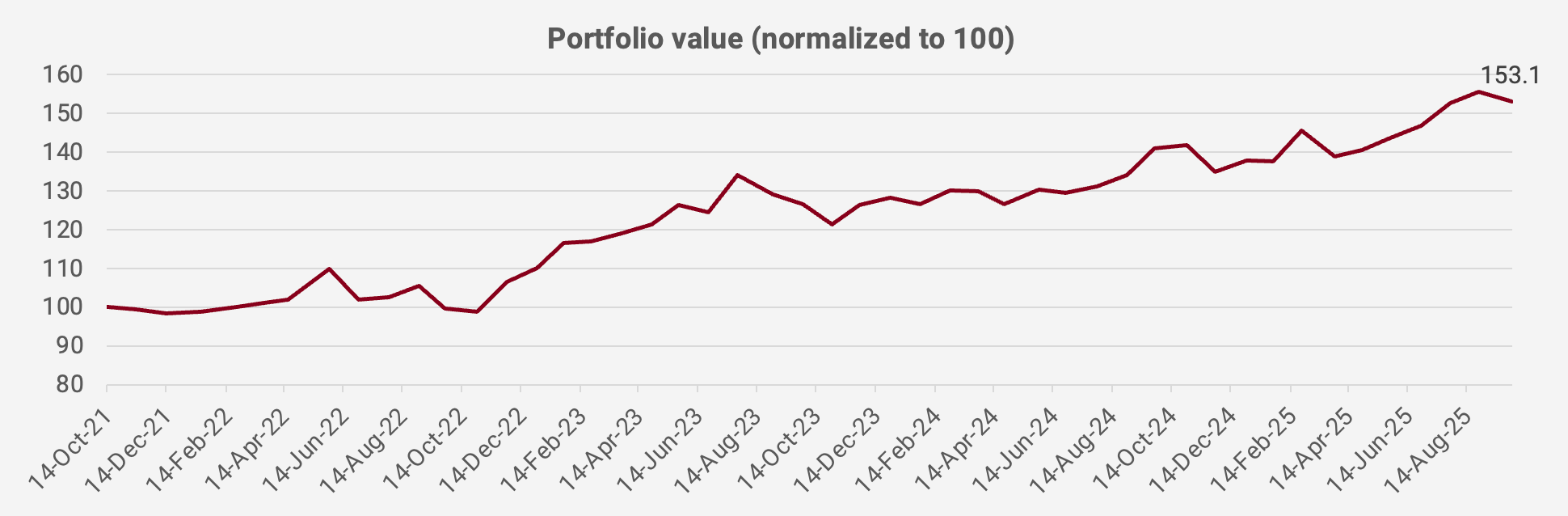 Here's a chart of the portfolio's value in US Dollar terms, with a decline of -1.7% month-on-month in September. Since the portfolio’s inception in October 2021, the value has increased by +53.1%, equivalent to a +11.3% compound annual growth rate: