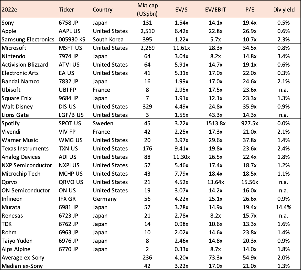 But the peer group is trading at significantly higher multiples - closer to 20x EV/EBIT based on median peer group trading multiples adjusted for Sony’s relative segment contribution.