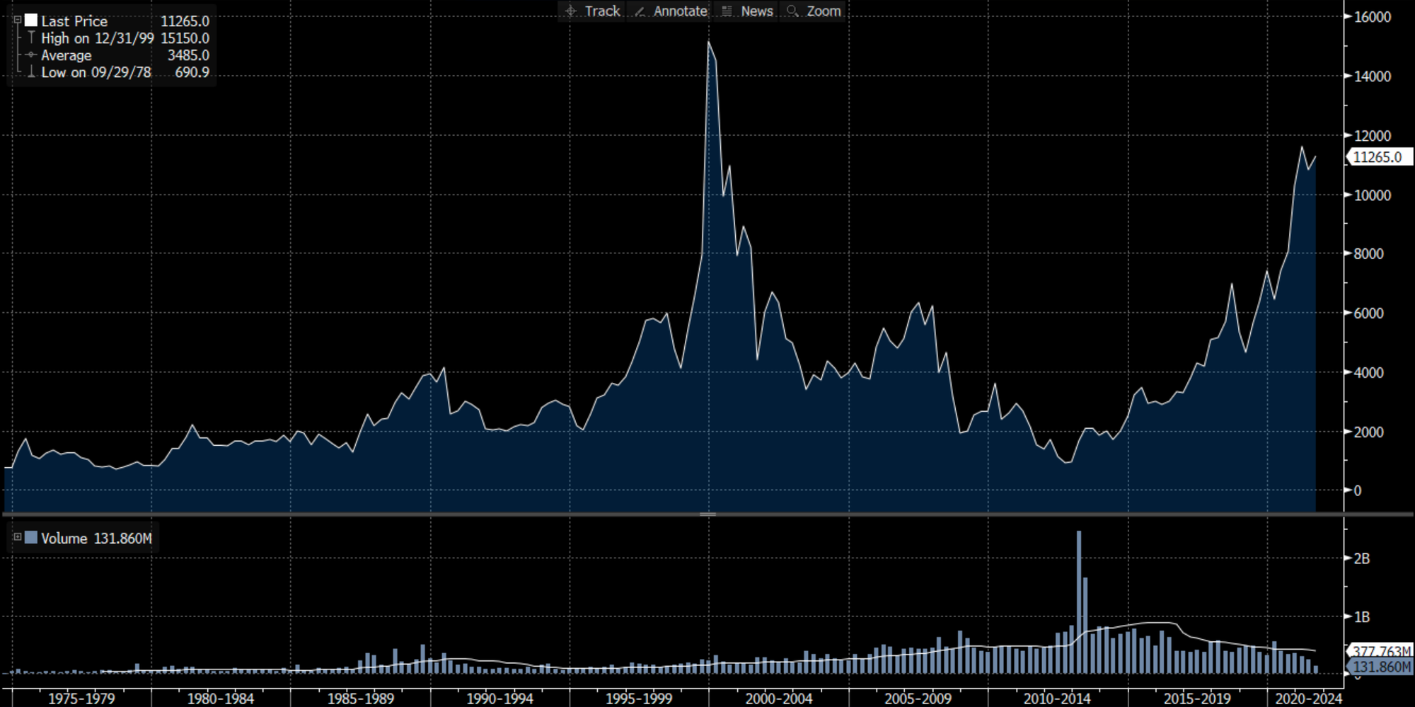 The stock is up roughly 10x since the bottom in 2013. Over the long run, the return CAGR has been more modest.
