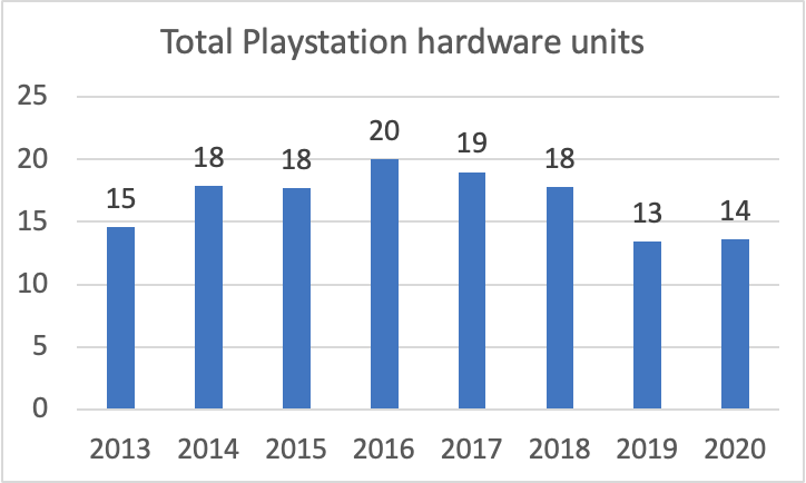 Sony’s 2020 console sales were 14 million compared to 20 million at the 2016 peak. It would take a 50% rise in console hardware units sold to reach prior records.