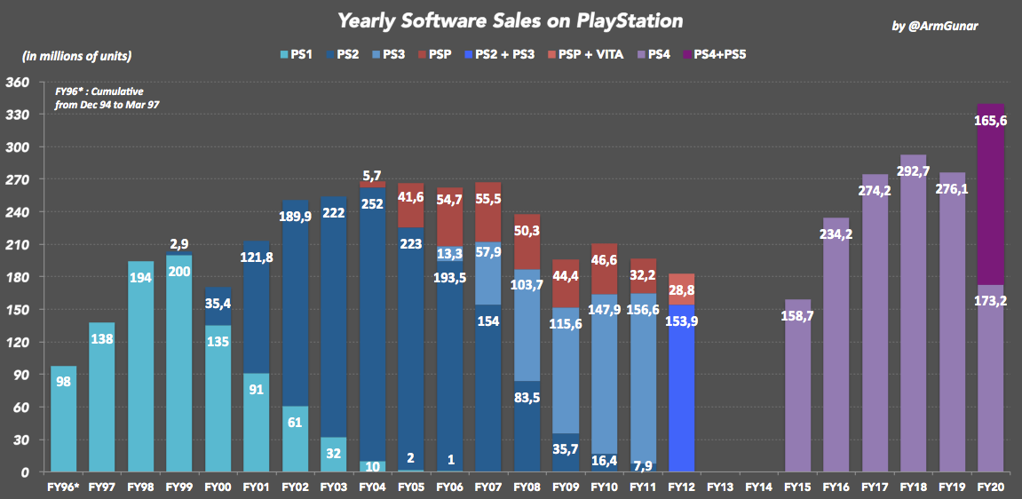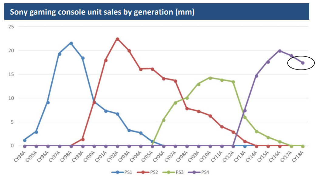 PlayStation 4 was released at the end of 2013, but the combined number of hardware units sold did not peak until 3 years later in 2016. The same pattern has been observed for Sony’s previous consoles PlayStation 1-3. So expect the ramp-up period for PlayStation 5 to be drawn out as well, not peaking until 2024-25.