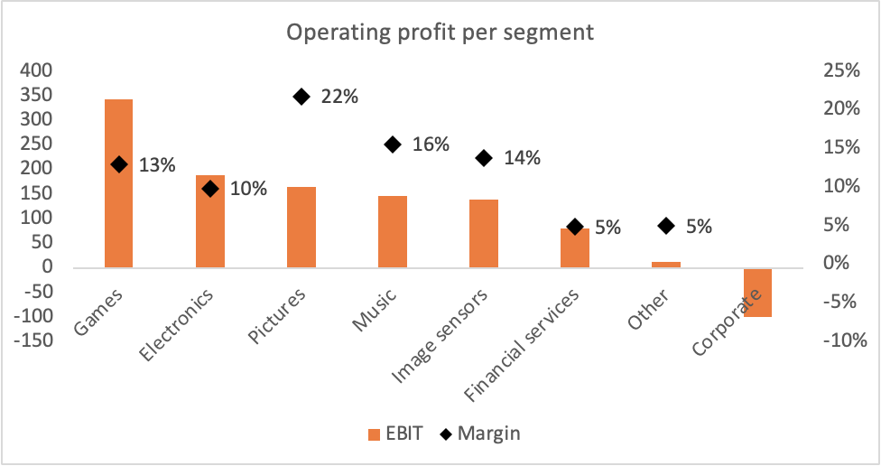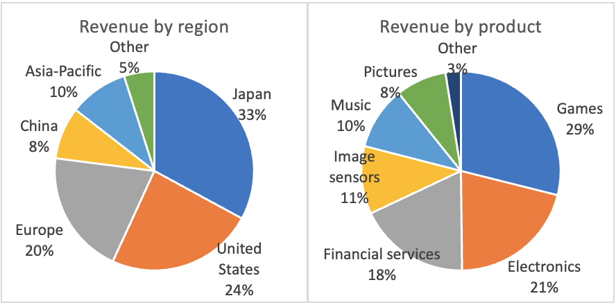 Sony’s largest segments include games & the Sony PlayStation network (close to 30%), followed by electronics (21%), financial services at 18%, image sensors at 11%, music at 10% and pictures at 8%.