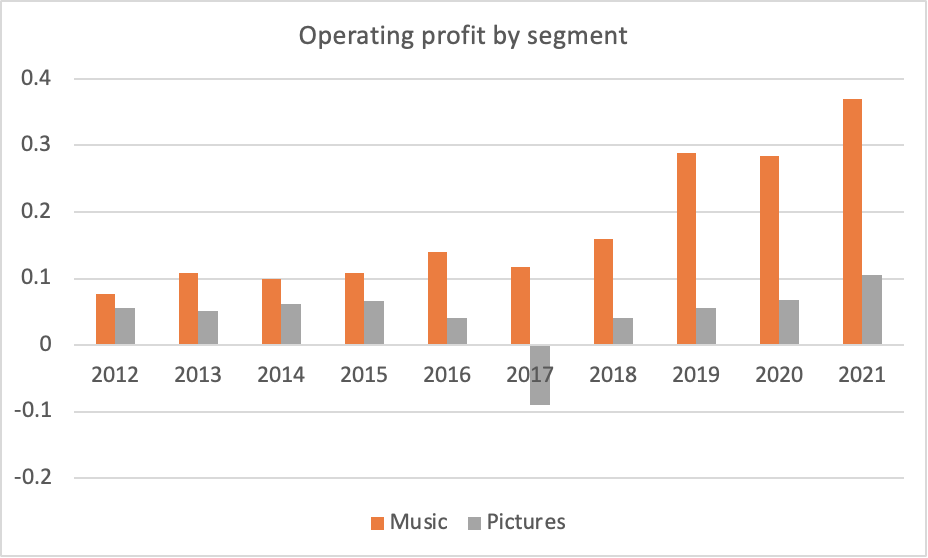 Acquiring EMI in 2018 at a total valuation of US$4.8 billion seems questionable to me as well, since the company only made US$160 million in operating profit the previous year. Perhaps demand for streaming of music will increase the value of EMI’s content library far in excess of the purchase price.