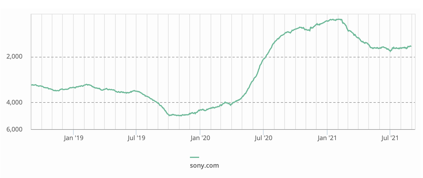 Alexa’s traffic rank for the website sony.com improved significantly during the pandemic and has then deteriorated since January 2021.