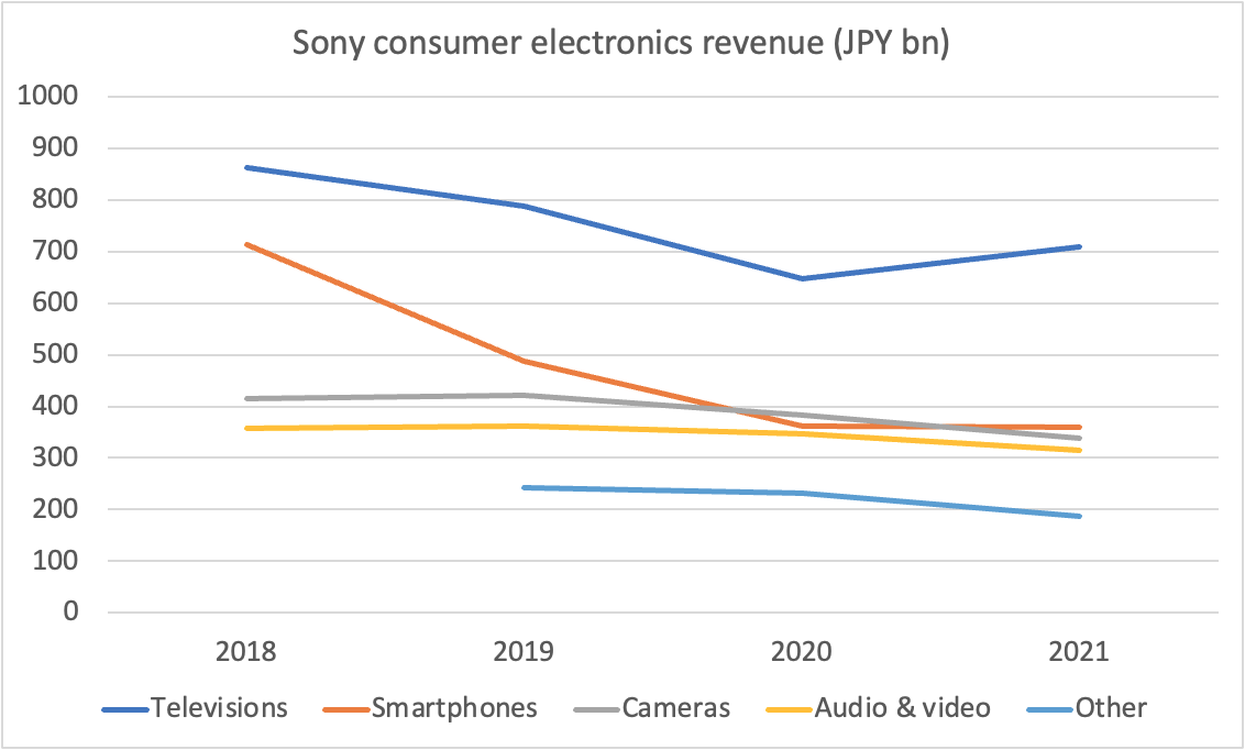 Sony’s consumer electronics revenue across televisions, smartphones, audio products has been weakening over time.