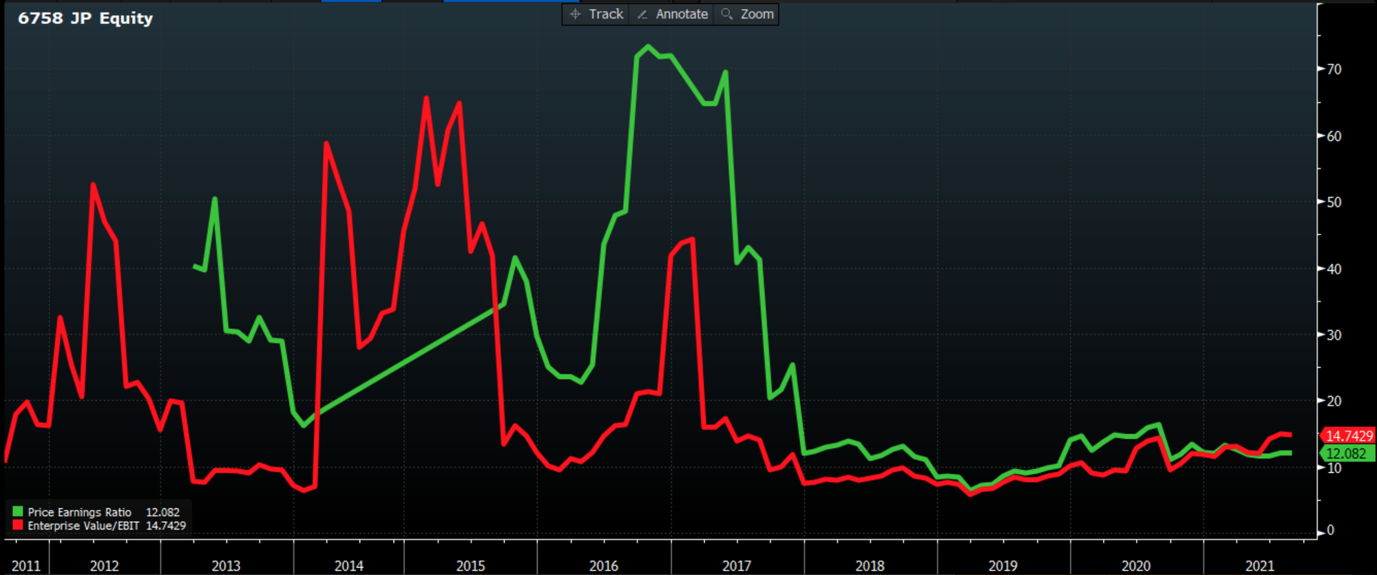 Over the past 10 years, Sony has traded at a median P/E of 14.6x and a median EV/EBIT of 12.2x. That happens to be exactly where Sony is trading now as well.