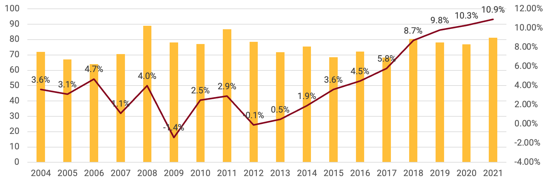 Sony’s revenues have been broadly flat over the past 16 years. The company’s operating margin has been rising steadily, however - especially since 2018. This margins expansion has been driven by the digitalisation of games for the Sony PlayStation console.