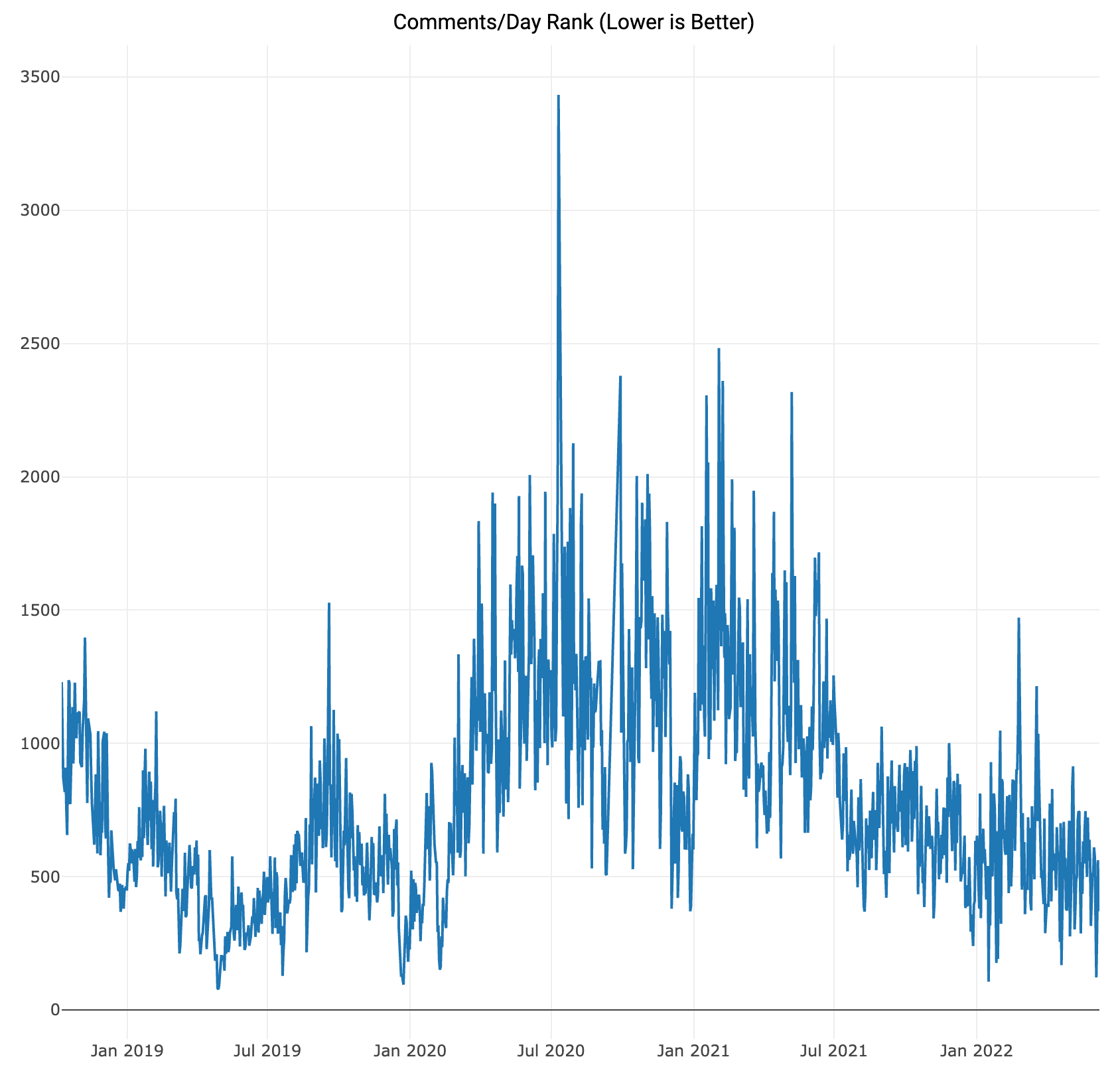 I’m also intrigued by the high number of comments on the r/boxoffice subreddit. In the chart below, its ranking is now at a similar level as in December 2019 (a lower ranking is better). So interest in the latest box office releases has already returned to pre-pandemic levels.
