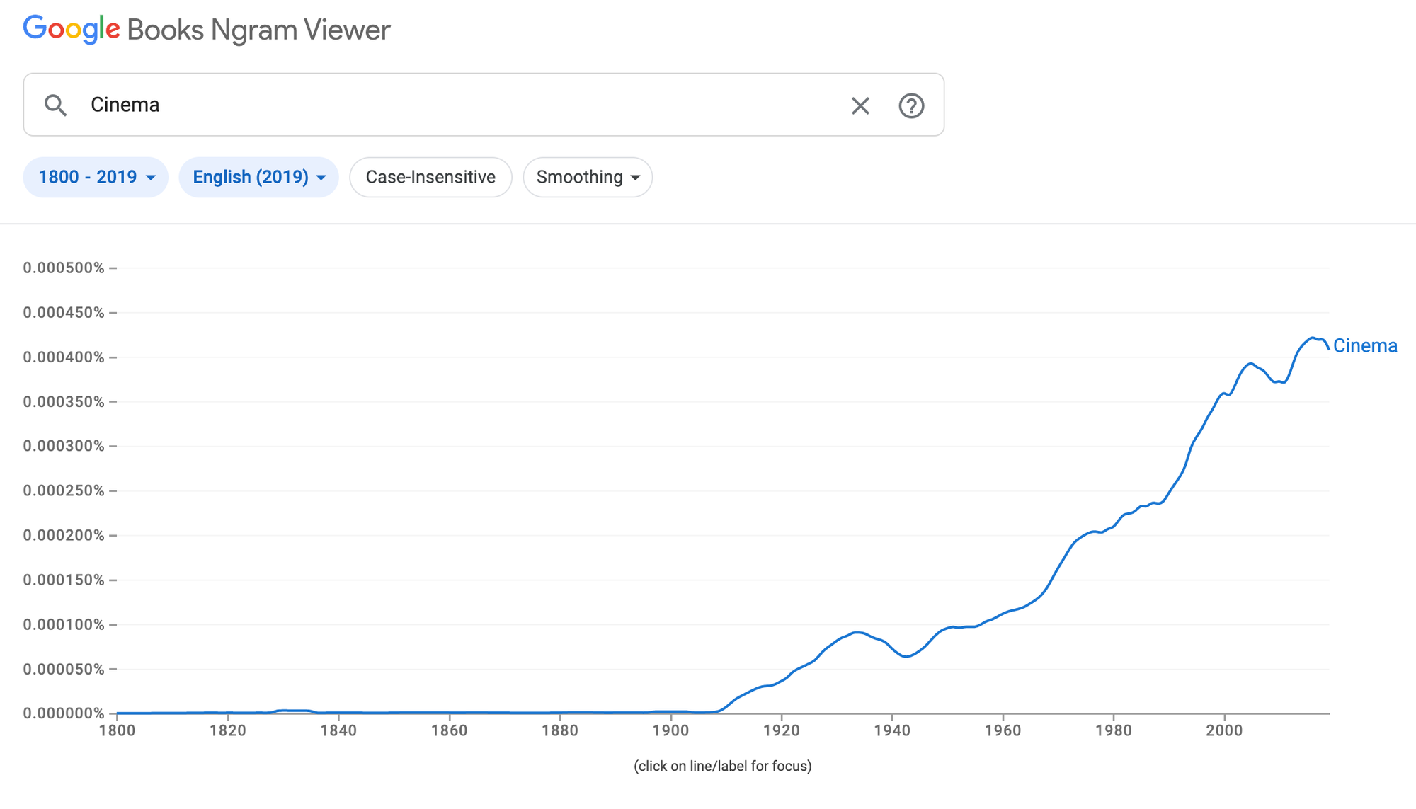 Judging from Google Ngram data, cinemas have become increasingly relevant since their birth around 1910 - despite inventions such as the TV, the VCR, the Internet and so on: